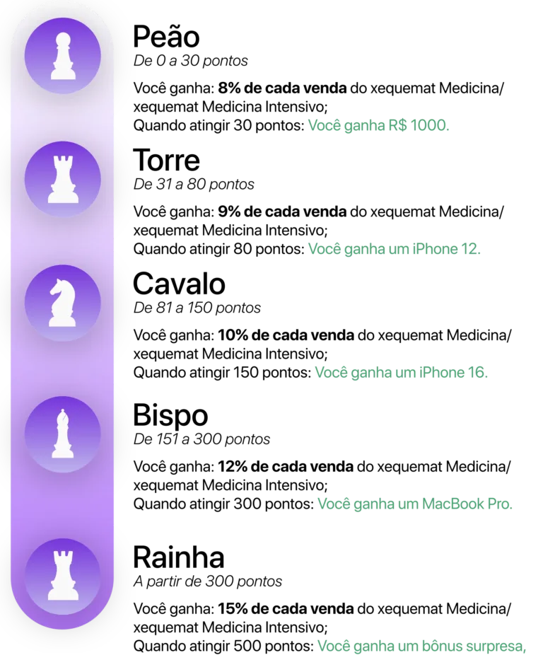 A cada venda que fizer de algum dos produtos que você poderá vender, ganhará pontos. Para cada nível, sua comissão na venda dos cursos xequemat Medicina Intensivo e xequemat Medicina. aumenta! E a cada mudança de nível você ganha prêmios também!